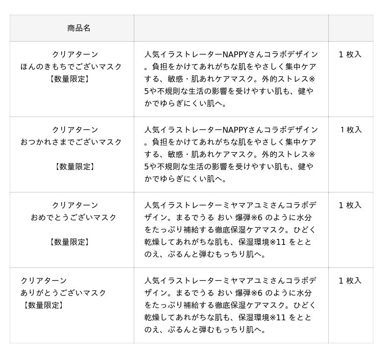 国内のギフト市場は、贈る側も受け取る側も気負わずに楽しめて、気軽に気持ちを伝える500円以下のカジュアルギフトの需要が広がっています。『クリアターン』からも、メッセージを書いて送れる限定デザインのシートマスクを数量限定で発売いたします。