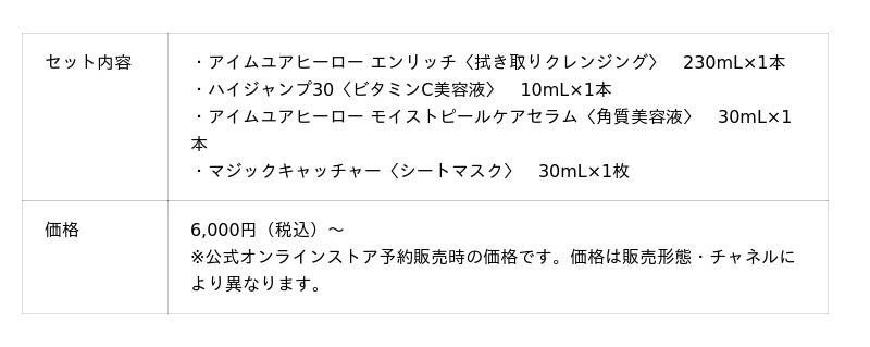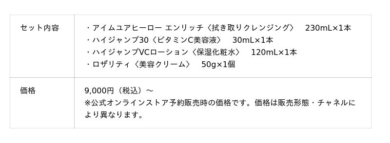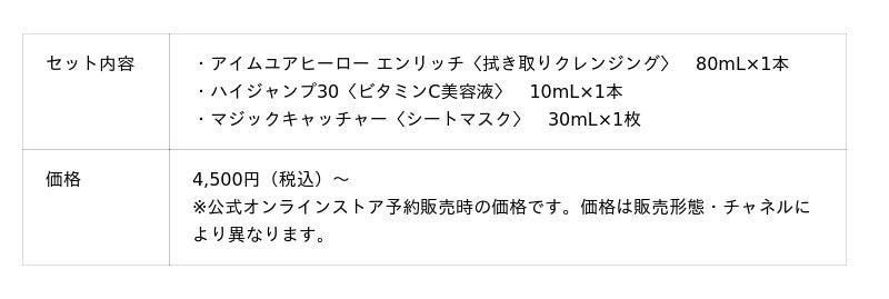 本コレクションでは、SISI人気アイテムの「アイムユアヒーロー〈拭き取りクレンジング〉」と「ハイジャンプ30〈ビタミンC美容液〉」を含む、3つのセットを展開。オリジナルベロアポーチも数量限定で付属する、ホリデーカラーに包まれた特別なセットです。