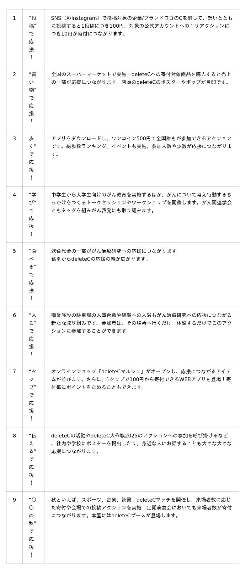 ■deleteC大作戦2025についてdeleteC大作戦とは、毎年9月のがん征圧月間に全国で「投稿」「買い物」「歩く」「学び」などのカジュアルソーシャルアクシ(CSA)を通じて、がん治療研究を寄付と啓発で応援する取り組みです。deleteC大作戦2025では、新たに「食べる」「入る(入場・入浴)」「伝える」「タップ」「音楽鑑賞・スポーツ観戦で応援!(〇〇の秋)」が加わり、計9つのアクションで実施します。