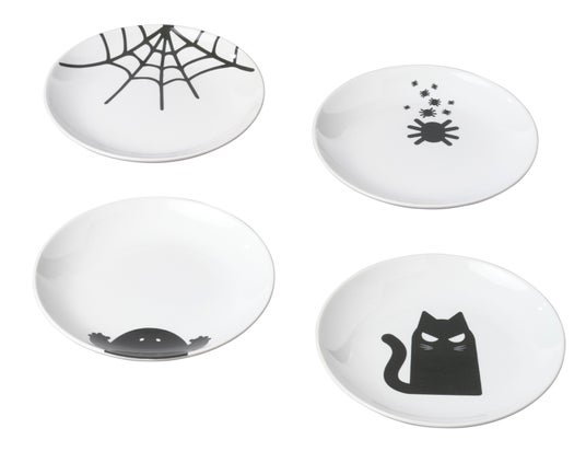 クモの巣、クモ、ネコ、おばけの4種類の模様がそれぞれに入っているサイドプレートセット。 好きなように組み合わせて、ハロウィンパーティーのテーブルコーディネートを盛り上げましょう。