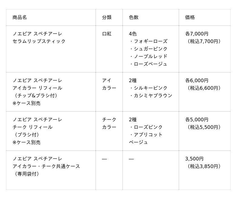 (左から)ノエビア スペチアーレ アイカラー、同 セラムリップスティック、同 チーク