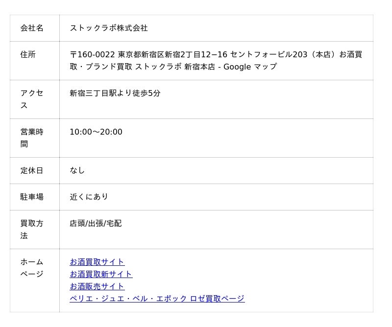 お酒買取専門店ストックラボのペリエ・ジュエ・ベル・エポック ロゼ買取の特徴を3つに分けて解説します。まずは、ストックラボの業者の概要をご確認ください。