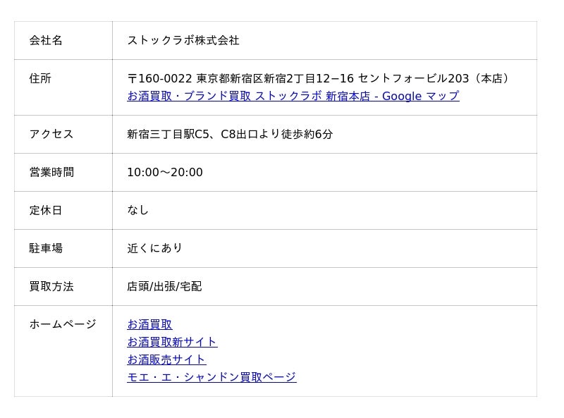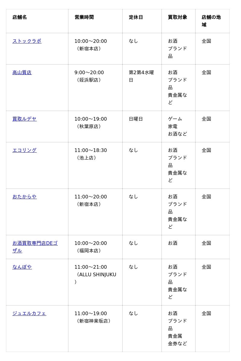 では、モエ・シャンドン買取におすすめの業者を見ていきましょう。まずは、各業者の主要情報をまとめた一覧表からご確認ください