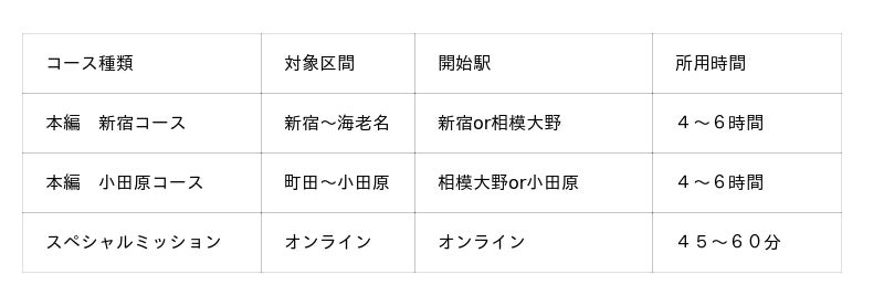 今回から本編は「新宿コース」と「小田原コース」の2コースに分かれ、開始駅を、それぞれ2駅から選択できるため、アクセスの良い駅から、おでかけの隙間時間でのご参加や複数日に分けてのご参加がしやすく、よりお気軽に楽しめる内容となっています。