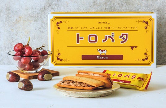 ミルクリッチでジューシーなラム漬けレーズン入りのマロンクリームを発酵バターたっぷりの香ばしいクッキーで挟んでいます。