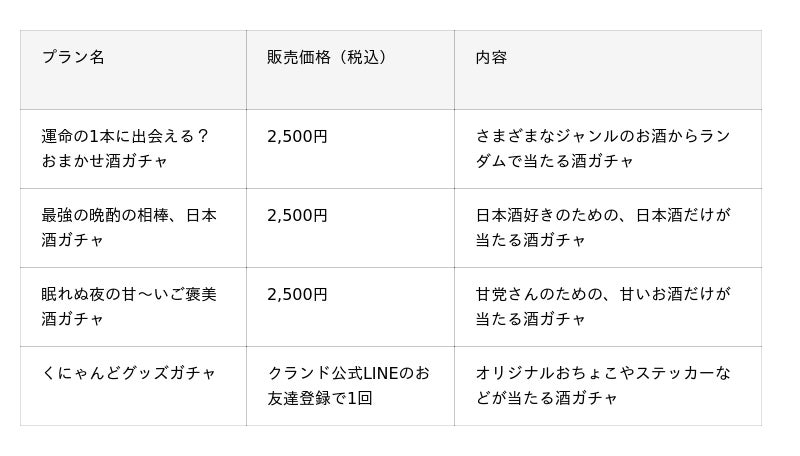 当たるお酒のラインアップには1本55,000円(税込)の30年熟成させた日本酒「天琥 -tenko- 30年」など、一般販売していないレアなお酒も入ります。他にもクランド公式LINEを友達登録すると回せる、「くにゃんどグッズガチャ」も登場します。