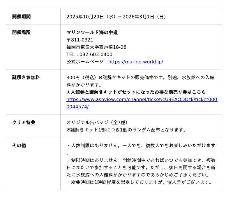人気アニメ『クレヨンしんちゃん』のメインキャラクターたちが活躍するリアル謎解きイベント「カスカベ防衛隊と人類おさかな計画の謎」が福岡県の水族館『マリンワールド海の中道』にて2025年10月29日(水)~2026年3月1日(日)の期間で開催されます。このイベントは、水族館を舞台に謎解きに挑戦する体験型のイベントで、九州圏での開催は初となります。