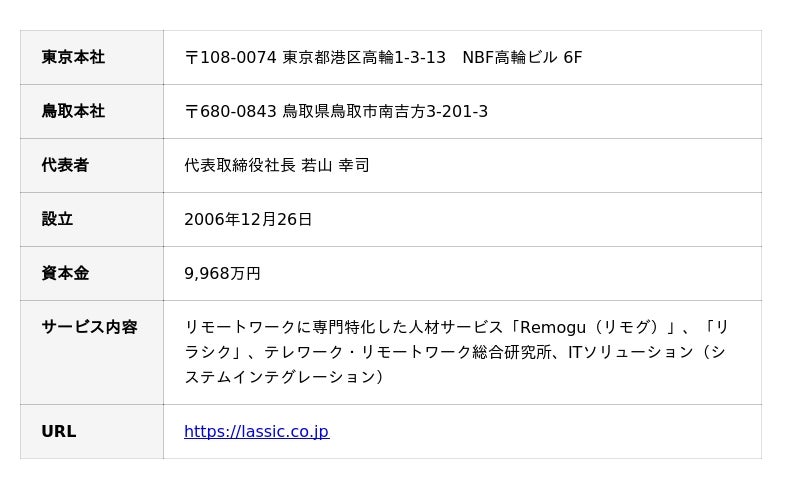LASSICは2006年に鳥取県で創業し、「リモート社会をリードし、ボーダレスワークの実現によって社会に貢献する。」をビジョンに、フリーランスITエンジニア向けリモートワーク専門JOBエージェント「Remogu(リモグ)フリーランス」(https://remogu.jp)、ITエンジニア向けリモートワーク専門転職エージェント「リラシク」(https://relasic.jp)などのサービスを通じて「採用」「DX」分野のボーダレス化に取り組んでいます。