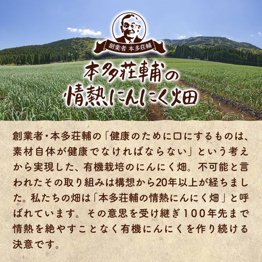 「にんにく王」は、同社の創業者・本多荘輔の名を冠した農場である「本多荘輔の情熱にんにく畑」で有機栽培されているブランドにんにくです。活力成分GSACを豊富に含み、小ぶりながら芳醇な香りと上品な甘みが特長。その風味は料理人からも高い評価を受けており、美味しさと栄養価を兼ね備えた特別なにんにくとして支持されています。