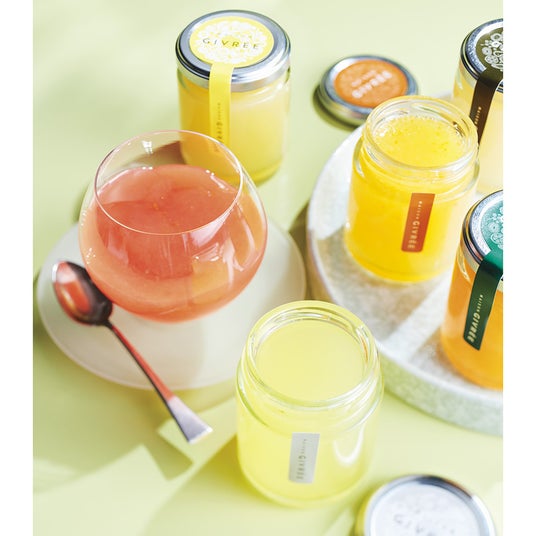 〈メゾンジブレー〉江森宏之シェフ自らが日本全国から柑橘を厳選。愛媛県宇和島産のブラッドオレンジなどを使用した6種のゼリー。個性豊かな柑橘の味わいを食べ比べできます。凍らせてシャーベットとしても美味しくお召しあがりいただけます。