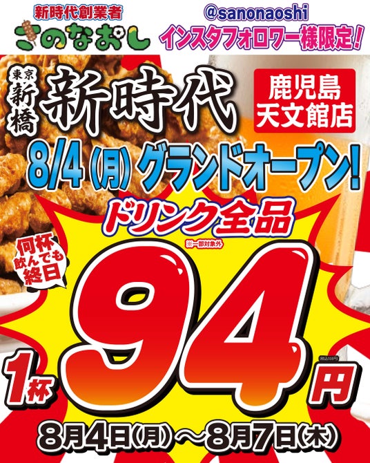 天文館初上陸を祝しまして、8月4日(月)~8月7日(木)はメガ以外のドリンク全品、何杯飲んでも終日1杯94円(税込103円)のオープン記念イベントを開催いたします!新時代創業者「さのなおし」(@sanonaoshi)のInstagramフォロワー様限定となっております。このチャンスをお見逃しなく!