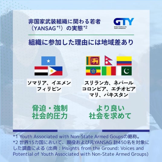 アフリカや中東などで紛争解決と平和構築に取り組む認定NPO法人アクセプト・インターナショナル(東京都中央区、代表理事:永井陽右)および同組織が運営するGlobal Taskforce for Youth Combatants(GTY)は非国家武装組織に関わる若者に目を向け、15ヶ国(ソマリア、イエメン、ケニア、インドネシア、コロンビア、マリ、スーダン、エチオピア、モザンビーク、ウガンダ、ハイチ、パキスタン、フィリピン、スリランカ、ネパール)において、計450人の紛争当事者の若者(YANSAG/ヤンサグ※)を対象に調査を実施しました。その調査結果からは、報道では見えてこない紛争当事者の実態が浮き彫りになりました。以下では9つの主要な発見についてお伝えします。