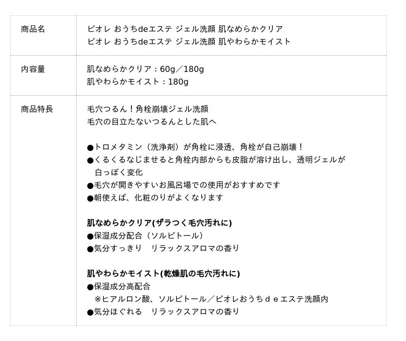 従来品である「ビオレ おうちdeエステ ジェル洗顔」は花王独自の角栓崩壊技術を採用し、ザラつく毛穴汚れを落とし、つるんとした肌に導きます。今回、肌になじませると、角栓内部からも皮脂が溶け出し、透明ジェルが白っぽく変化するように改良しました。