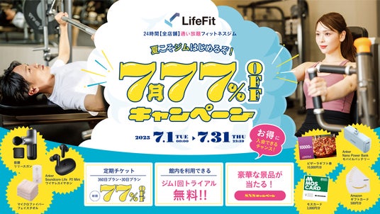 ITを活用したヘルステック事業を展開する株式会社FiT(本社:京都府京都市、代表取締役:加藤恵多、以下「FiT」)は、2025年7月1日(火)~2025年7月31日(木)の1ヶ月間、24時間フィットネスジム「LifeFit」にて「夏こそジムはじめるぞ!7月77%OFFキャンペーン」を開催いたします。