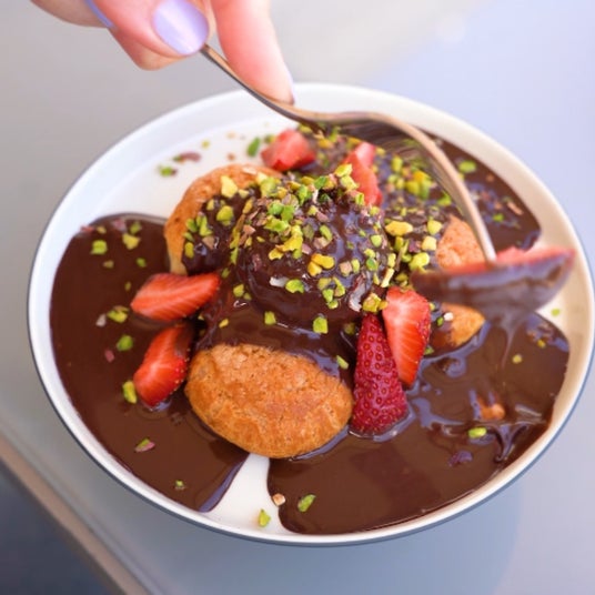 小さなシュー生地の中にクリームをフィリングし、上からdivanのオリジナルチョコレートソースをたっぷりとかけたスイーツ。