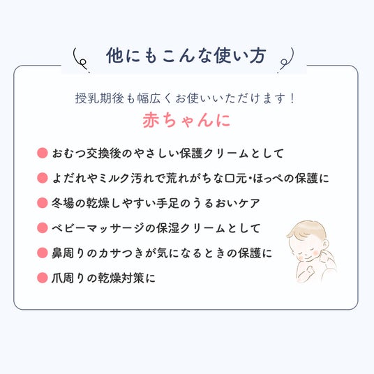 商品特徴:唇やスキンケア・かかとや指先の割れなど、気になる乾燥に。乳頭保護クリームとして乳首ケアにもご利用いただけます。