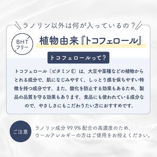 ※ラノリン99.9%配合の高濃度のため、ウールアレルギーの方はご使用をお控えください。