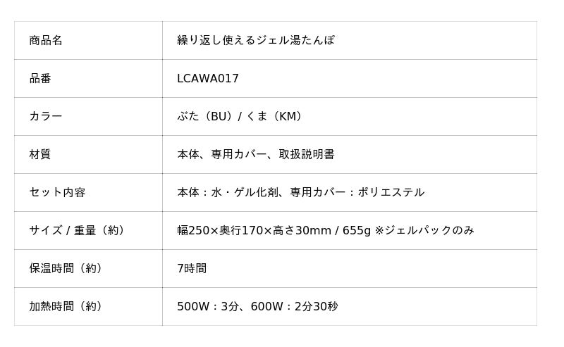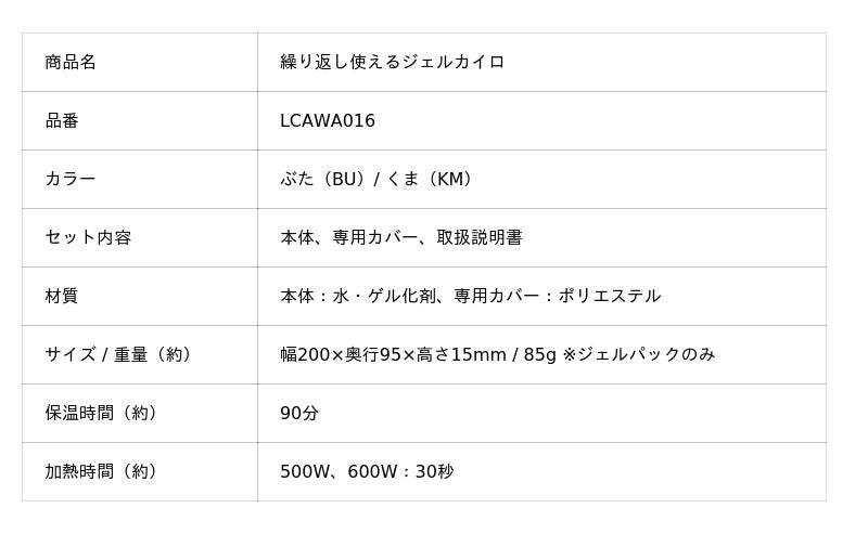 「繰り返し使えるジェル湯たんぽ」LCAWA017