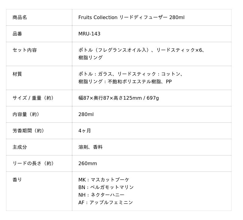「Fruits Collection リードディフューザー 280ml」 MRU-143