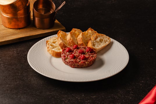 馬肉の赤身と鉄分を、フランボワーズの酸味が引き立てるフレンチバルならではの前菜です。