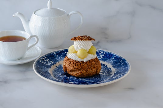 熊本では二毛作により秋にもメロンが旬を迎え、夏と秋の2回メロンを食べる習慣があります。寒暖差の影響で夏に比べ甘さが増す秋メロンを贅沢に使用し、生の果肉をくり抜いてそのままシュークリームの上に乗せました。季節感あふれるデザートです。