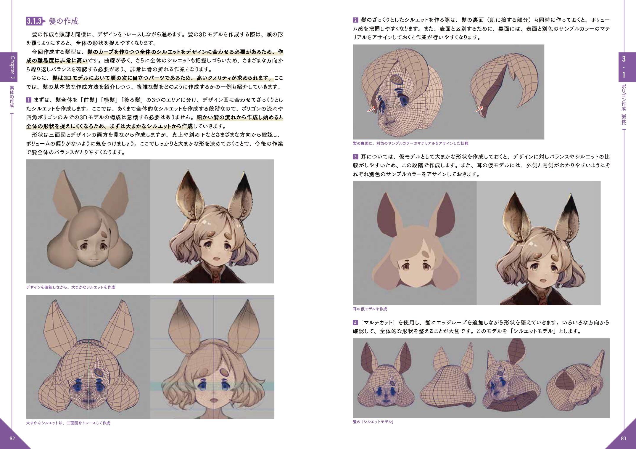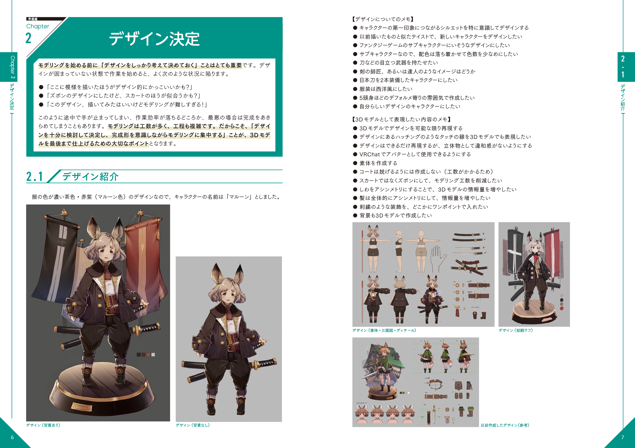 服の作成では、デザイン画の印象をモデルで表現するためのコツも紹介。また、キャラクター制作に欠かせないシェーダー設定についても、イラスト制作の手順に倣い、各要素を一つずつ整理することで、形状づくりから質感・陰影づけに至るまで、立体としての「魅せ方」にまで踏み込んで解説しています。