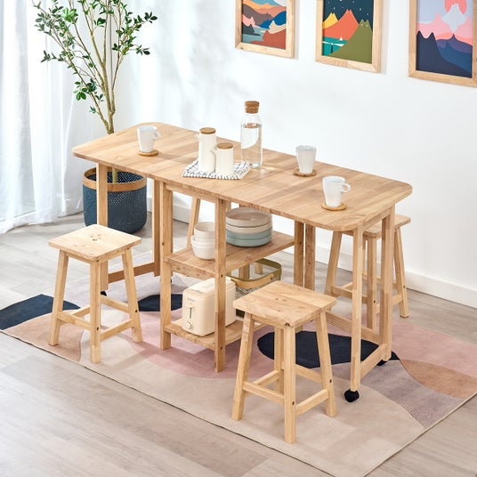 天然木が美しいスツールが収納できる伸長式ダイニング5点セット。