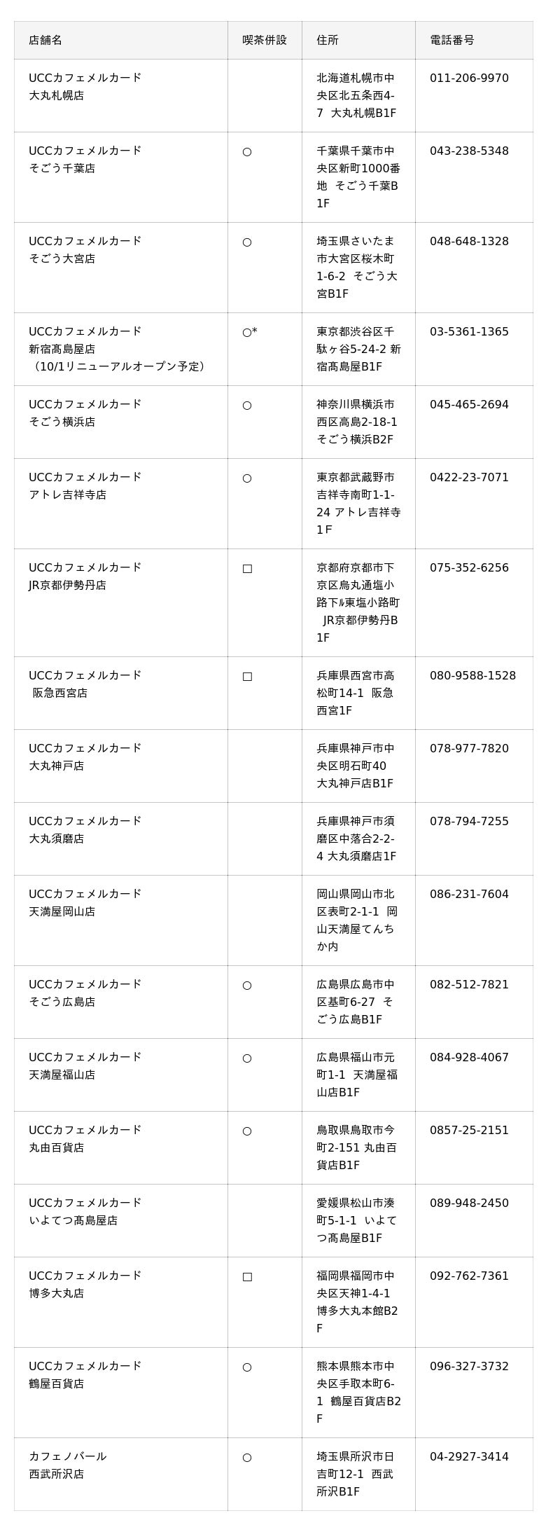 ・コーヒー豆挽き売り業態「UCCカフェメルカード」17店舗、「カフェノバール」1店舗  計18店舗