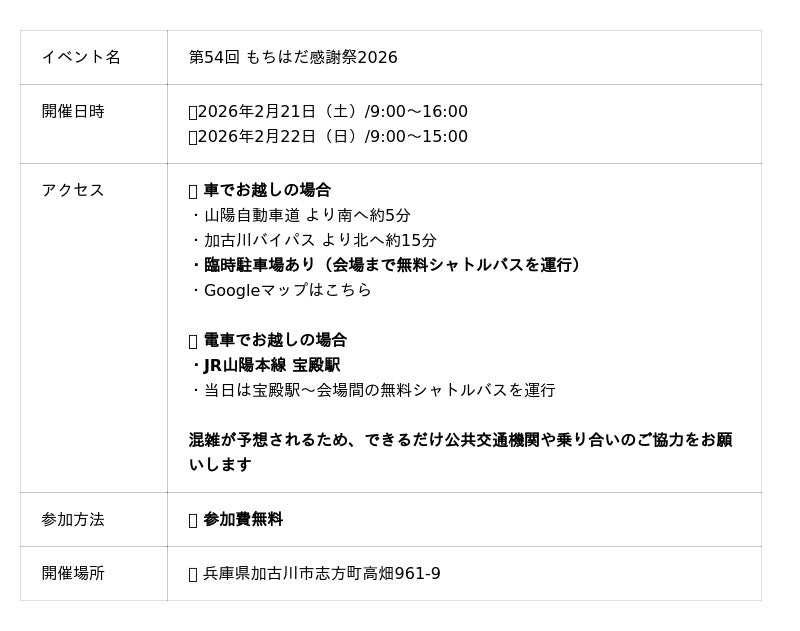 【加古川イベント】もちはだ(R)感謝祭、2月21~22日の土日開催!昨年は1日で来場者5000人超&売上1800万超!1年に一度、田舎の工場に大行列をつくる直売イベント!