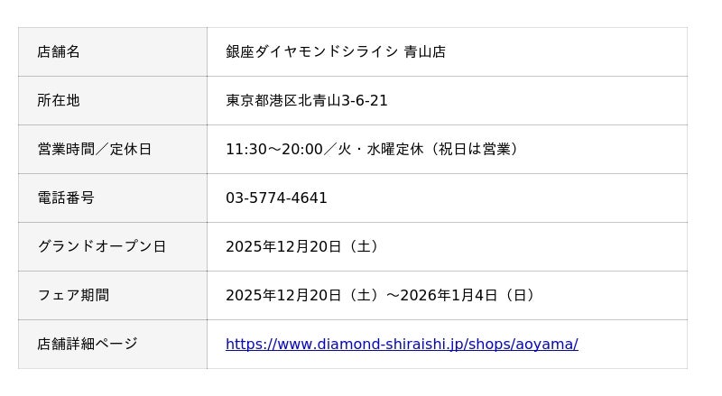 日本最大級の成約数を誇る日本初*のブライダルジュエリー専門店「銀座ダイヤモンドシライシ」(運営:株式会社NEW ART、東京都中央区、代表 濱野えり)は、68店舗目となる新店舗「銀座ダイヤモンドシライシ 青山店」を2025年12月20日(土)、東京・青山にグランドオープンいたします。また、オープンを記念し、ご成約特典を用意した「Grand Opening Fair」を2026年1月4日(日)まで開催いたします。