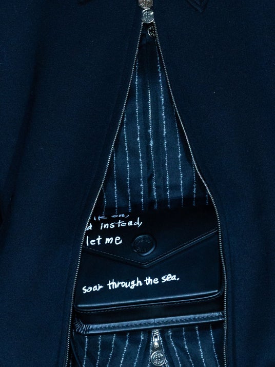革にシーズンテーマの”Good morning, I wish I could fly, never mind.”をシルクスクリーンでプリント。インクを流し込むように擦るため濃度などに個体差が生じ、全く同じ仕上がりのものは二つとありません。また、バッグ完成時に絵柄がひと続きになるようにしているため、組み上げにも裁断にも高い精度が求められます。