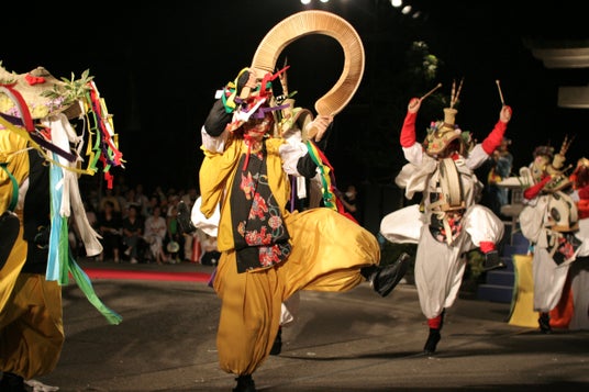 中世芸能「田楽(でんがく)」を現代に蘇らせた創作舞台「大田楽」は、仮面と色鮮やかな衣装をまとった演者たちが、笛や太鼓の音にあわせて躍動する、古と今が交差する幻想的な舞です。山代温泉では毎年夏に「山代大田楽」として開催され、地元住民や観光客に親しまれています。