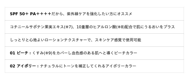 (※5)メイクアップ効果による印象演出 (※6)韓国語で「お姉ちゃん」の意味 (※7)保湿成分 (※8)ヒアルロン酸Na、加水分解ムコ多糖、ヒアルロン酸ビドロキシプロビルトリモニウム、ヒアルロン酸クロスポリマーNa、加水分解ヒアルロン酸、アセチルヒアルロン酸Na、ヒアルロン酸、加水分解ヒアルロン酸Na、ヒアルロン酸K:すべて保湿成分 (※9)乾燥による