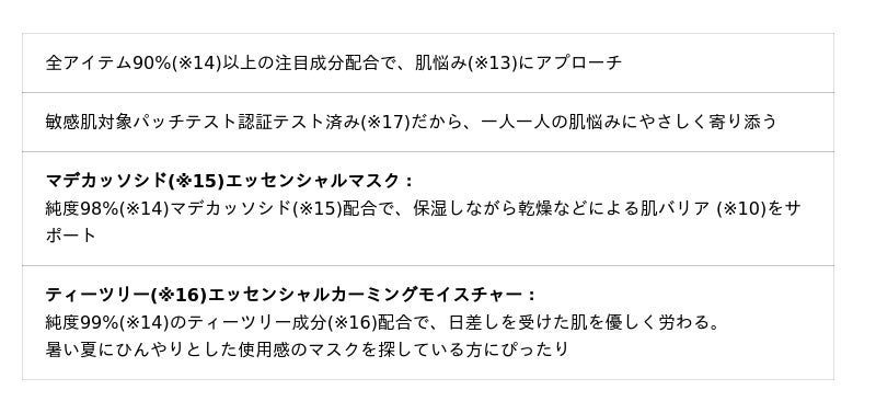 「エッセンシャルマスク」は、肌悩み(※13)に合わせて選べる豊富なバリエーションがポイント。
