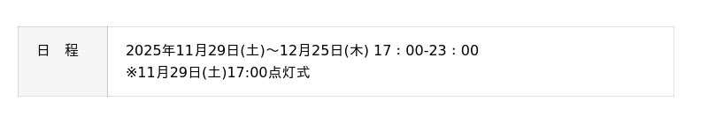 冬の夜を彩るきらめきとともに屋外は幻想的な雰囲気に包まれ、きらびやかな光の装飾は、訪れる方々に心温まるひとときをお届けします。初日11月29日(土)17時には、「クリスマスイルミネーション点灯式」を開催いたします。