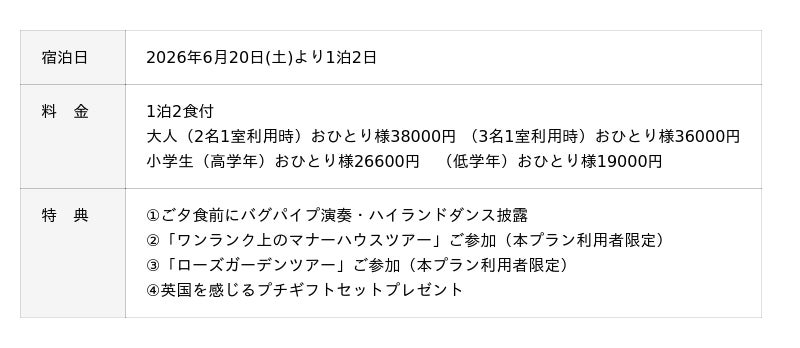 【宿泊プラン詳細】https://www.british-hills.co.jp/stay/news/357/