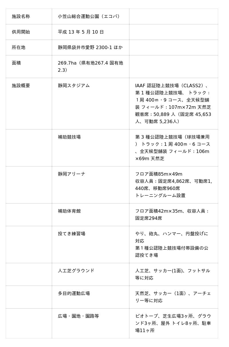 小笠山総合運動公園(エコパ)は、静岡県を代表する都市公園であり、スタジアム、アリーナを含む多様な施設を有する県内有数のスポーツ・交流拠点です。