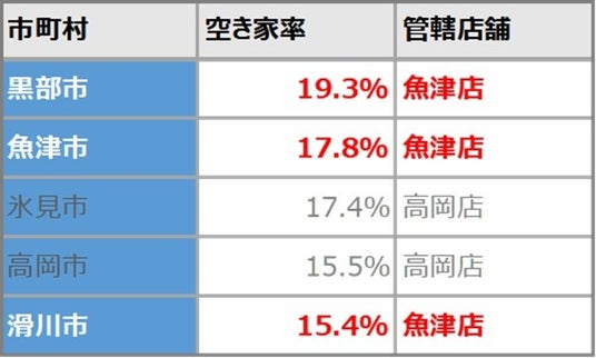 このたび新店舗を構える魚津市は、県内で2番目に空き家率が高い市町村です。さらに、県内で最も空き家率が高い黒部市や、5番目に高い滑川市も管轄します。*²