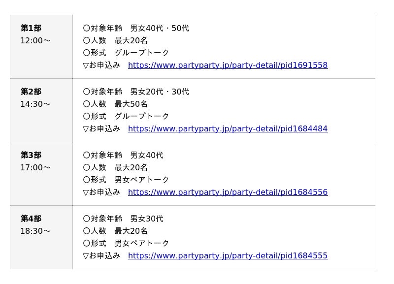 ■1,000円分の飲食チケット付き!年齢層、トーク形式別で全4部開催