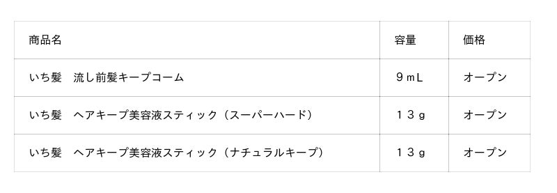 また、「ヘアキープ美容液スティック」2品もリニューアル。いち髪独自の「切れ毛ケア美容液処方」を採用し、アホ毛をしっかり抑えながら、「純・和草プレミアムオイル」配合の美容液成分で、切れ毛を予防。次のアホ毛の発生も予防します。