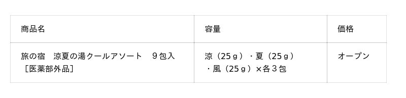 「旅の宿」夏の定番「涼夏の湯クールアソート」は、冷涼成分「メントール」を配合し、湯上がり気分爽快な「涼」・「夏」・「風」3種類を詰め合わせた数量限定商品です。シトラスミントの香りの「涼」は瑠璃色(るりいろ)、ハーバルミントの香りの「夏」は浅葱色(あさぎいろ)、フレッシュミントの香りの「風」は薄浅葱色(うすあさぎいろ)のとうめいな湯色で、香りからも視覚からも夏らしさを感じていただけます。