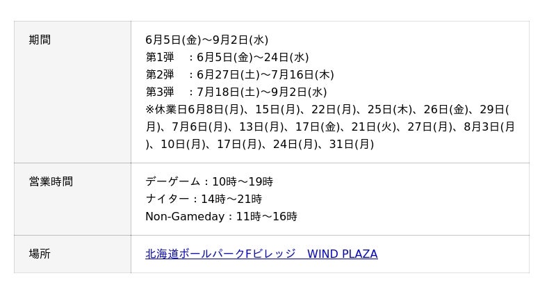 北海道を誇るサッポロ クラシックを楽しめるのはもちろん、北海道初出店の絶品グルメが、期間を3つに分けてFビレッジに集結!約200席の開放的なテラス席で、試合日・試合がない日を問わず、お楽しみいただけます。