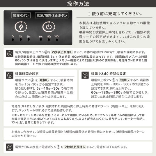 水を使わず、オイル原液をそのまま噴霧することで、濃密な香りを素早く空間全体に広げます。