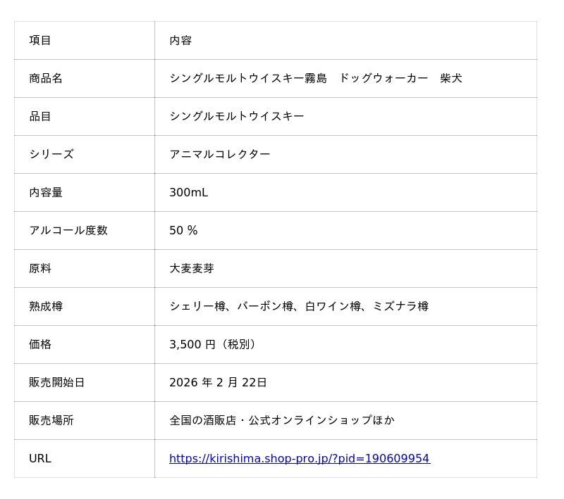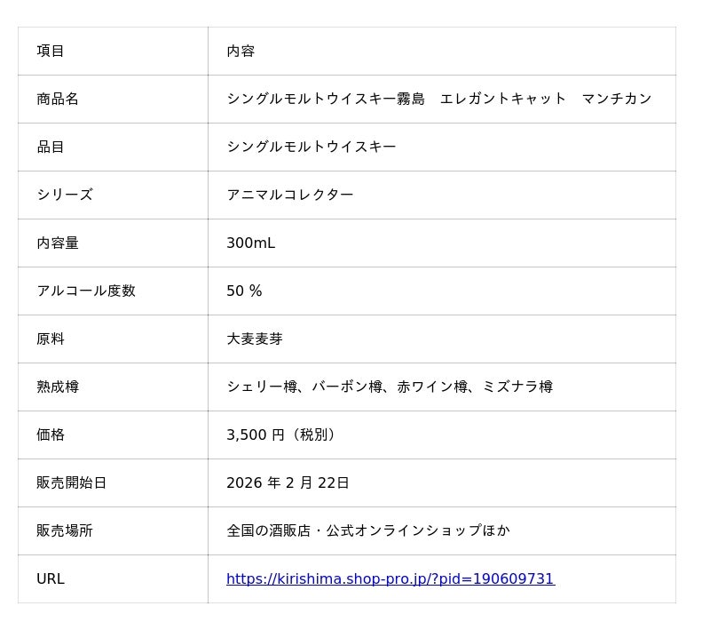 霧島横川蒸留所(所在地:鹿児島県霧島市横川町)は、新作ウイスキー『シングルモルトウイスキー霧島 エレガントキャット マンチカン』(300ml)および、『シングルモルトウイスキー 霧島 ドッグウォーカー 柴犬』(300ml)を発売いたします。