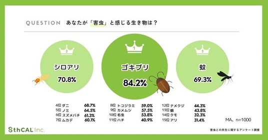 まず初めに、「害虫だと思う生き物」を尋ねたところ、最も多くの人が害虫と認識していたのは「ゴキブリ」(84.2%)でした。