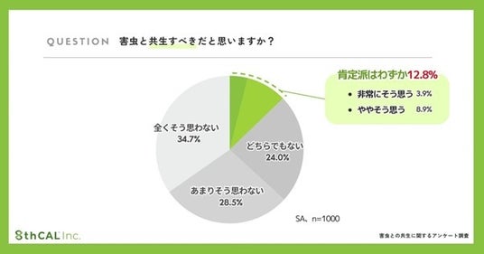 さらに一歩踏み込み、「害虫と共生すべきだと思うか」を尋ねたところ、「非常にそう思う」「ややそう思う」と答えた共生肯定派は合わせて12.8%にとどまりました。