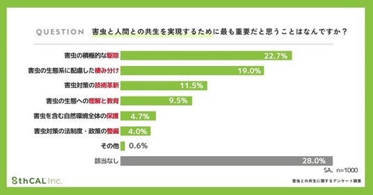 「害虫と人間との共生を実現するために最も重要だと思うことは?」という問いに対し、最も多かったのは「害虫の積極的な駆除」(22.7%)でした。