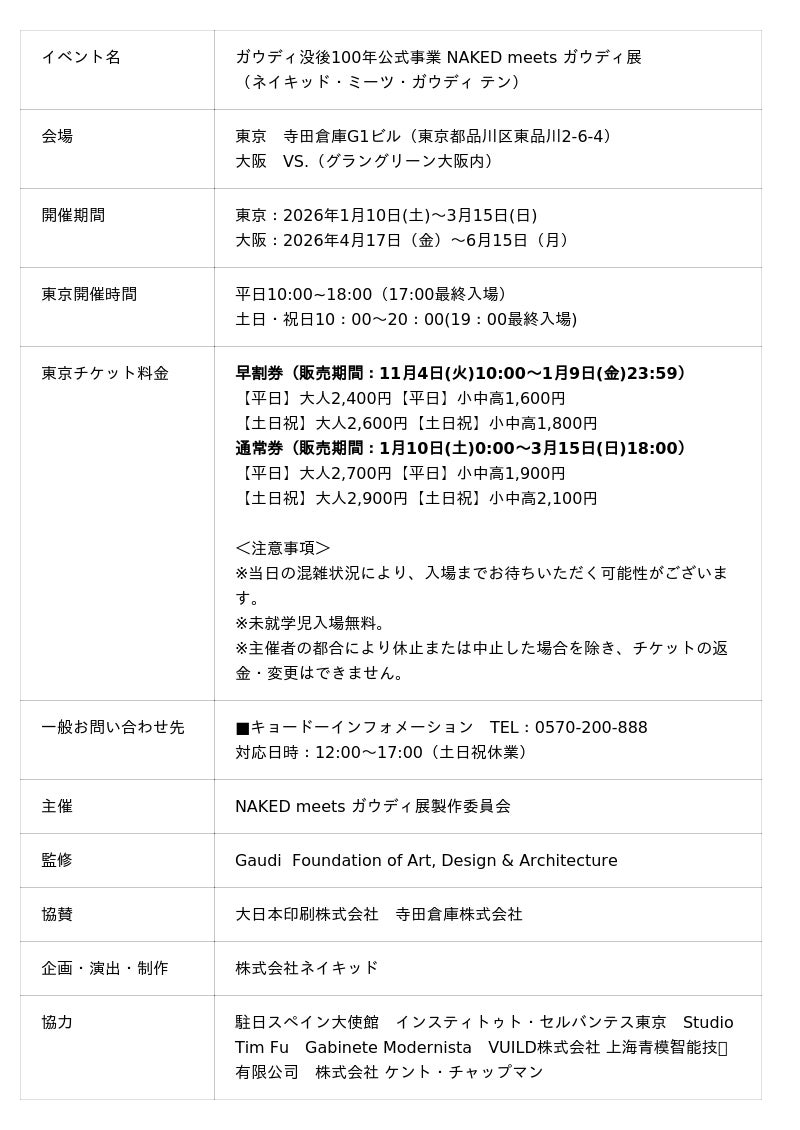 株式会社ネイキッド(英語表記:NAKED, INC./所在地:東京都渋谷区/代表:村松亮太郎)は、2026年1月10日(金)から3月15日(日)まで寺田倉庫G1ビルにて開催される「ガウディ没後100年公式事業 NAKED meets ガウディ展」(主催:NAKED meets ガウディ展製作委員会)において、展覧会の開催にあわせ、寺田倉庫、りんかい線とのタイアップ企画を実施します。
