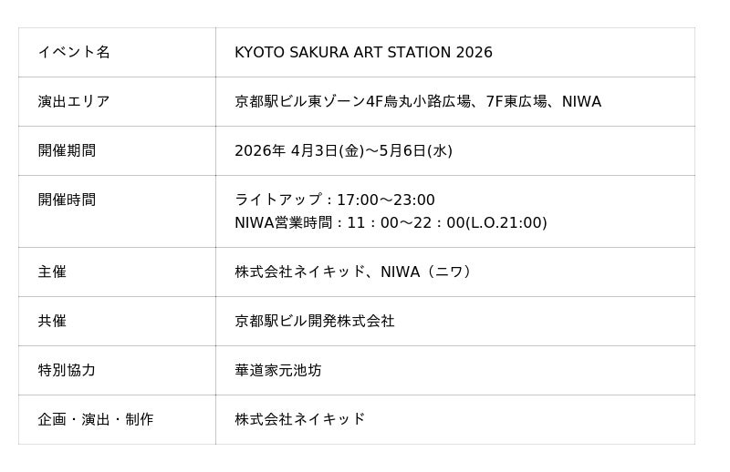 株式会社ネイキッド(NAKED, INC.)は、2026年4月3日(金)から5月6日(水)まで、京都駅ビル7F東広場を中心に、“桜アート”を楽しみながら京都駅ビルを巡る期間限定イベント「KYOTO SAKURA ART STATION 2026」を開催いたします。本イベントは、新たな人の流れと賑わいを生み出すことを目指し、京都駅ビル東ゾーンを中心に、「駅がアートになる」文化発信拠点として活性化を図るプロジェクト「NAKED ART STATION」の一環として実施いたします。