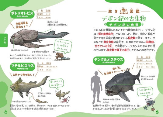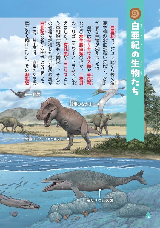 それぞれの大絶滅に巻き込まれ現在では存在しない生物たちを、 川崎悟司さんによるオールカラーの美しいイラストとポップなキャラクターで紹介するとともに、 各時代の環境や絶滅の原因、生き延びた生物たちの発展について、豊富な説明文で楽しく解説していきます。 監修は、古生物学の権威、東北大学名誉教授の海保邦夫教授。 子どもから大人まで楽しめるよう、すべての漢字に「ふりがな」つき!